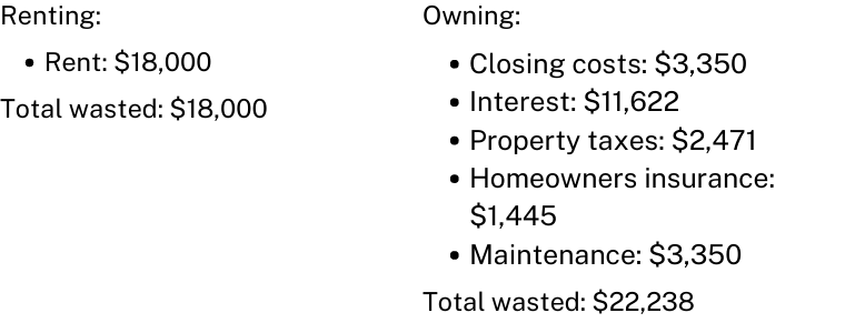As you’ll be able to see, you “throw away” considerably extra in your first 12 months of homeownership than you’ll be renting. And positive, closing prices are a one-time price moderately than an ongoing one. However even in case you get rid of that price, you continue to throw away extra money per 12 months proudly owning a house than you do renting.